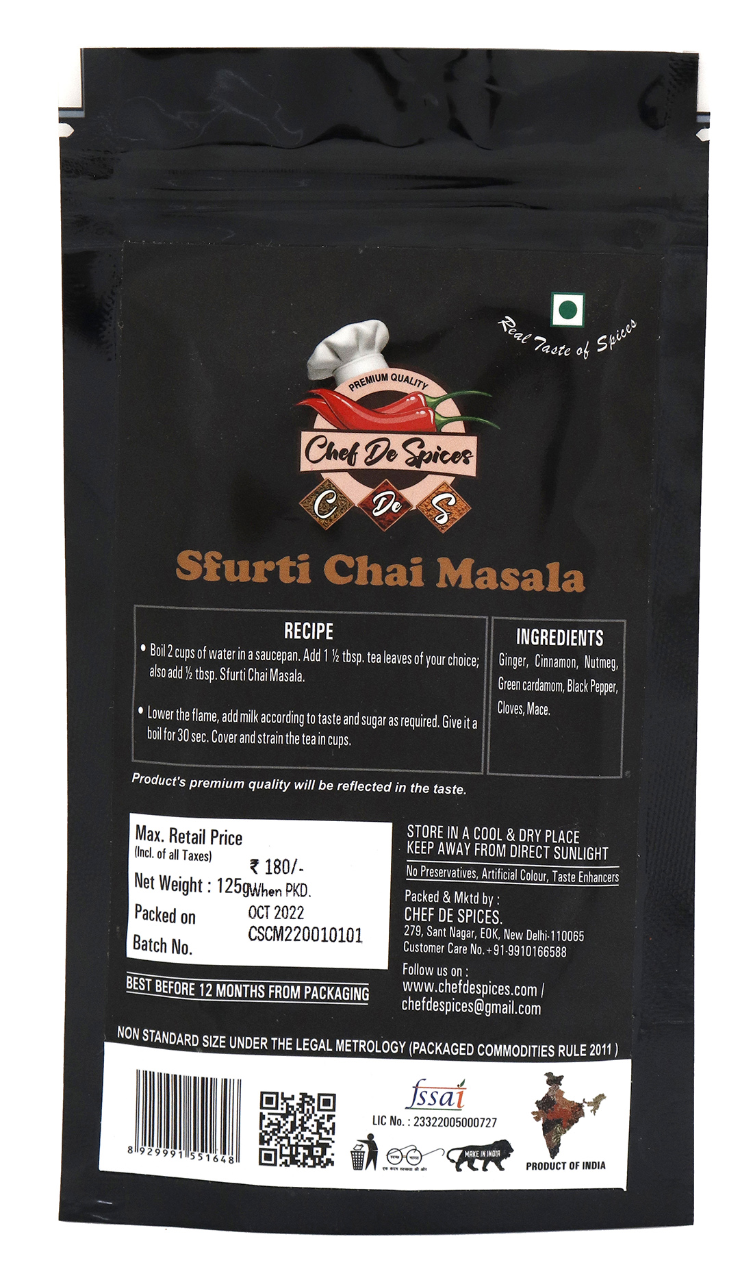 Sfurti Chai Masala: Boil 2 cups of water in a saucepan. Add 1 ½ tbsp. tea leaves of your choice; also add ½ tbsp. Sfurti Chai Masala. Lower the flame, and add milk according to taste and sugar as required. Give it a boil for 30 sec. Cover and strain the tea in cups.